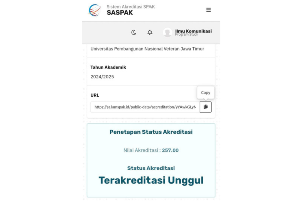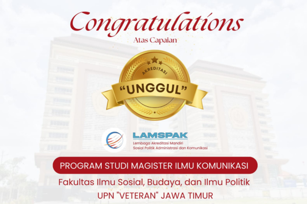 Ikomupnjatim – Program Studi Magister Ilmu Komunikasi Universitas Pembangunan Nasional “Veteran” Jawa Timur (UPNVJT) berhasil meraih akreditasi Unggul dari Lembaga Akreditasi Mandiri Sosial, Politik, Administrasi, dan Komunikasi (LAMSPAK). Raihan ini menegaskan keberhasilan program studi dalam melampaui standar mutu pendidikan tinggi yang telah ditetapkan.