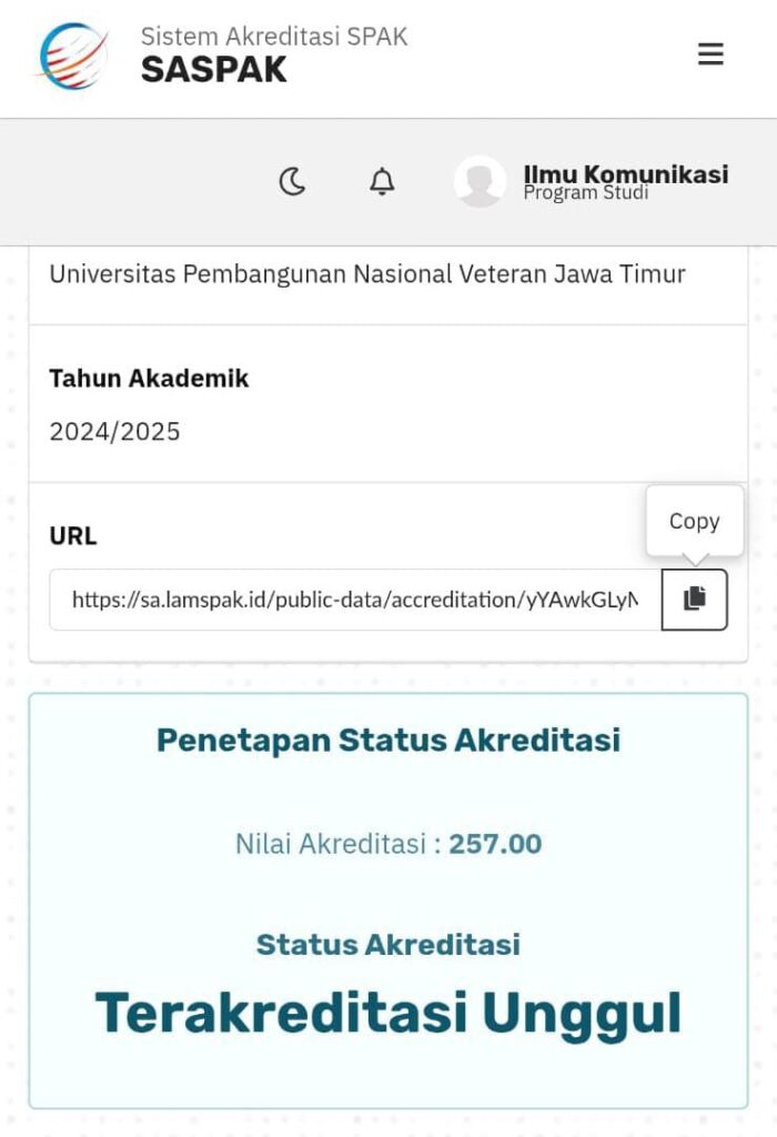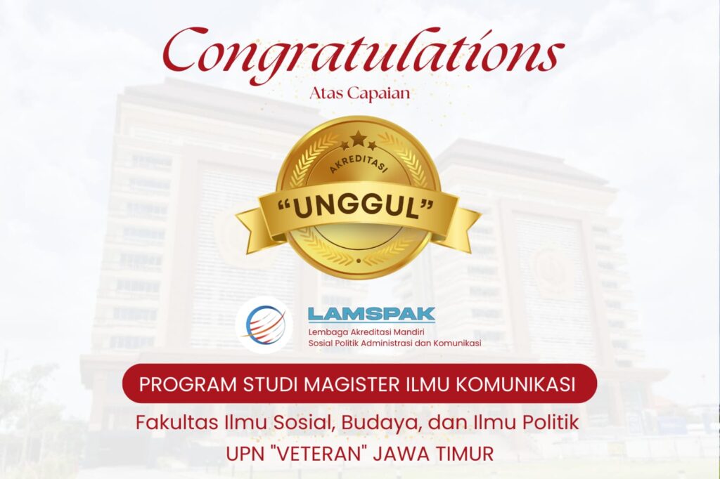 Program Studi Magister Ilmu Komunikasi Universitas Pembangunan Nasional Veteran Jawa Timur (UPNVJT) berhasil meraih akreditasi Unggul dari LAMSPAK. Raihan ini menegaskan keberhasilan program studi dalam melampaui standar mutu pendidikan tinggi nasional, sekaligus memperkuat posisi UPN Veteran Jawa Timur sebagai perguruan tinggi yang konsisten mengembangkan kualitas akademik di tingkat pascasarjana.